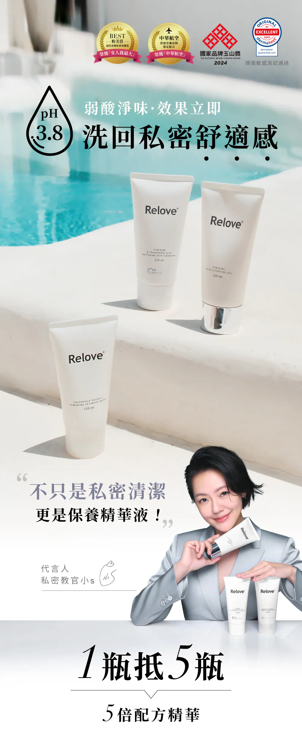 「Relove 胺基酸私密潔淨凝露」,以溫和弱酸配方徹底潔淨並維持私密肌水嫩